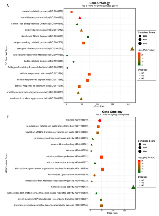 GO enrichment analysis, provided by the R Studio Enricher package, showed that down-regulated DEGs were significantly enriched in 64 biological processes (BP), 18 molecule functions (MF), and 6 cellular components (CC). The top five BP included “steroid metabolic process” (GO:0008202), “cellular response to zinc ion” (GO:0071294), “cellular response to copper ion” (GO:0071280), “exogenous drug catabolic process” (GO:0042738), and “cellular response to cadmium ion” (GO:0071276). The top five MF included “steroid hydroxylase activity” (GO:0008395), “oxidoreductase activity” (GO:0016712), “arachidonic acid epoxygenase activity” (GO:0008392), “estrogen 2-hydroxylase activity” (GO:0101021), and “arachidonic acid monooxygenase activity” (GO:0008391). The top five CC included “Endoplasmic Reticulum Membrane” (GO:0005789), “Membrane Attack Complex” (GO:0005579), “Collagen-Containing Extracellular Matrix” (GO:0062023), “Serine-Type Endopeptidase Complex” (GO:1905370), and “Endopeptidase Complex” (GO:1905369) (Figure 2A). Up-regulated DEGs were significantly enriched in 78 BP, 5 MF, and 13 CC. The top five terms were “mitotic spindle organization” (GO:0007052), “microtubule cytoskeleton organization involved in mitosis” (GO:1902850), “regulation of mitotic cell cycle phase transition” (GO:1901990), “anaphase-promoting complex-dependent catabolic process” (GO:0031145), and “regulation of G2/M transition of mitotic cell cycle” (GO:0010389) for BP. The top five MF were “protein serine/threonine kinase activity” (GO:0004674), “histone kinase activity” (GO:0035173), “protein kinase binding” (GO:0019901), “cyclin-dependent protein serine/threonine kinase regulator activity” (GO:0016538), and “microtubule motor activity” (GO:0003777). For GO CC, the top five terms included “Spindle” (GO:0005819), “Microtubule Cytoskeleton” (GO:0015630), “Intracellular Non-Membrane-Bounded Organelle” (GO:0043232), “Nucleus” (GO:0005634), and “Cyclin-Dependent Protein Kinase Holoenzyme Complex” (GO:0000307) (Figure 2B).