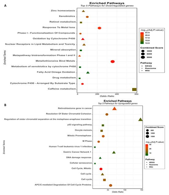 We performed functional annotation for DEGs using three distinct pathway analyses: the Kyoto Encyclopedia of Genes and Genomes (KEGG), Reactome, and WikiPathways. Down-regulated DEGs were significantly enriched in 15 KEGG, 38 Reactome, and 29 Wiki pathways. KEGG analysis showed that down-regulated DEGs were mainly enriched in Caffeine, Retinol, Drug metabolism, “Mineral absorption”, and “Metabolism of xenobiotics by cytochrome P450”. The top five Reactome pathways were “Metallothioneins Bind Metals”, “Cytochrome P450—Arranged by Substrate Type”, “Response to Metal Ions”, “Phase I—Functionalization Of Compounds”, and “Xenobiotics”. In the Wikipathways the main terms were “Oxidation by Cytochrome P450”, “Metapathway biotransformation Phase I and II”, “Nuclear Receptors in Lipid Metabolism and Toxicity”, “Zinc homeostasis” and “Fatty Acid Omega Oxidation”. The number of significantly enriched pathways for the up-regulated DEGs was 7 (KEGG), 81 (Reactome), and 11 (WikiPathways). The top five KEGG pathways were “Cell cycle”, “Oocyte meiosis”, “p53 signaling pathway”, “Human T-cell leukemia virus 1 infection” and “Cellular senescence”. Reactome pathways were “Cell Cycle, Mitotic”, “Mitotic Prometaphase”, “M Phase”, “APC/C-mediated Degradation Of Cell Cycle Proteins” and “Resolution Of Sister Chromatid Cohesion”. The top five Wiki pathways were “Retinoblastoma gene in cancer”, “Cell cycle”, “Regulation of sister chromatid separation at the metaphase-anaphase transition”, “Gastric Cancer Network 1” and “DNA damage response”. Pathways enrichment are depicted in Figure 3A,B.