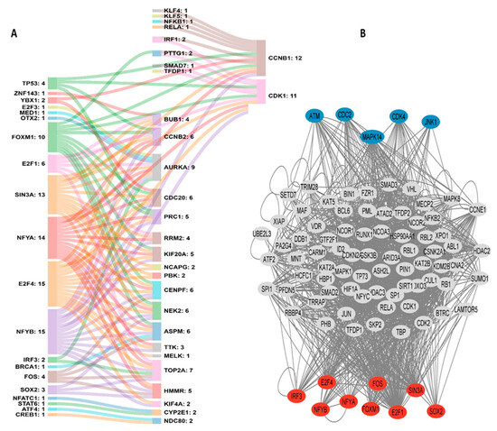 Transcription factors and Hub genes. (A) Sankey diagram providing insights into the relationships between TFs and genes that compose the HCC signature. (B) Expression kinases network, retrieved and adapted from https://maayanlab.cloud/X2K/ (accessed on 15 June 2023). Red nodes represent the top transcription factors predicted to regulate the expression of the Hub genes; gray nodes represent intermediate proteins that physically interact with the enriched TFs and connect them. Blue nodes represent the top predicted protein kinases known to phosphorylate downstream proteins.