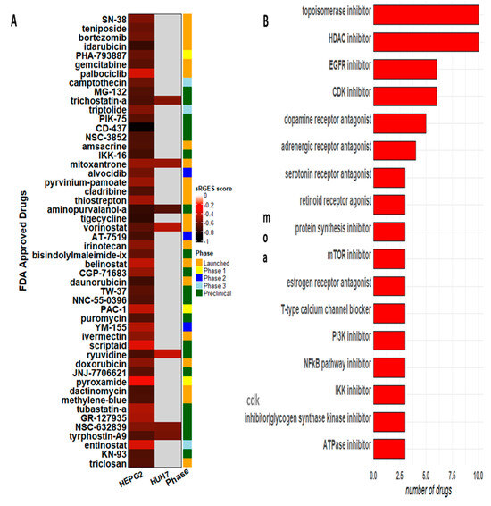 By selecting the drugs that have been tested in HCC cells only, such as Huh7.5 and HepG2, we retrieved 190 candidate compounds, which are categorized into the following experimental stages: 70 “launched”, 9 “phase 1”, 1 “phase 1/2”, 13 “phase 2”, 1 “phase 2/3”, 11 “phase 3”, 81 “preclinical stage”, and 4 drugs were withdrawn. The top 50 drugs ranked by sRGES are depicted in Figure 5A. Among the candidate compounds, we could verify a big diversity of mechanisms of action (moa), but inhibitors of HDAC, topoisomerase, CDK, EGFR, and dopamine receptor antagonists were the moa shared by at least five different chemicals (Figure 5B). From the 347 target genes retrieved from the OCTAD database, ADRA1A, CDK1, CDK2, EGFR, GSK3B, HDAC1, HTR2A, HTR2C, and TOP2A are target genes of at least 8 different drugs (Figure S6A). Nine of our genes are shared with the OCTAD database: AURKA, CCNB1, CDK1, FOXM1, IRF3, RELA, RRM2, TOP2A, and TP53 (Figure S6B). These genes are targets of the following drugs: danusertib and JNJ-7706621 (AURKA); kenpaullone (CCNB1); alvocidib, aminopurvalanol-a, AT-7519, CDK1-5-inhibitor, indirubin, JNJ-7706621; kenpaullone, PHA-793887 (CDK1); thiostrepton (FOXM1); piceatannol (IRF3); bortezomib, caffeic-acid-phenethyl-ester, pyrrolidine-dithiocarbamate, triptolide (RELA); cladribine, gemcitabine (RRM2); amonafide, amsacrine, daunurobicin, doxorubicin, idarubicin, mitoxantrone, pirarubicin, podofilox, teniposide (TOP2A); pifithrin-mu (TP53). Details about each drug are described in Table S2.