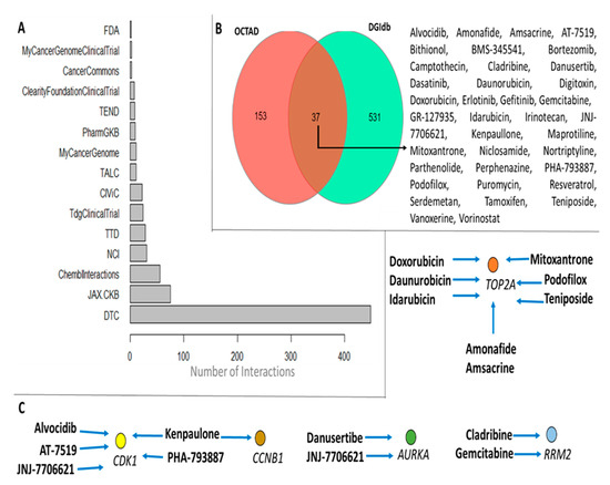 Drug and target-gene interactions: (A) different sources where the interactions were retrieved; (B) drugs shared in two distinct databases; and (C) druggable genes and their respective compounds. FDA: Food and Drug Administration; TEND: Trends in the exploitation of novel drug targets; TALC: Targeted Agents in Lung Cancer; CIViC: Clinical Interpretation of Variants in Cancer; NCI: NCI Cancer Gene Index; JAX-CKB: The Jackson Laboratory Clinical Knowledgebase; DTC: Drug Target Commons. Blue arrows mean that the expression pattern may be reversed after treatment.