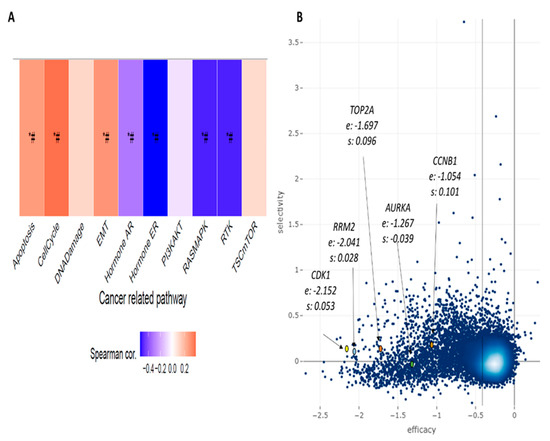 Lastly, we verified whether the selected druggable genes are critical entities for events involved with the tumorigenesis process. Through gene set variance analysis (GSVA) and the pathway activity module, we verified some cancer-related pathways and their relationship with our genes. Apoptosis, cell cycle, and epithelial mesenchymal transition (EMT) showed a positive and significant correlation; on the other hand, the hormone AR, hormone ER, RASMAPK, and RTK pathways correlate inversely with our genes (Figure 7A). The essentiality of our genes for cell survival was evaluated by the shinyDepMap tool (https://labsyspharm.shinyapps.io/depmap (accessed on 24 August 2023)), which presents the efficacy and selectivity of specific genes regarding cell growth. Though the five genes had lower selectivity, all of them presented relative high efficacy, especially TOP2A, RRM2, and CDK1 genes (Figure 7B).