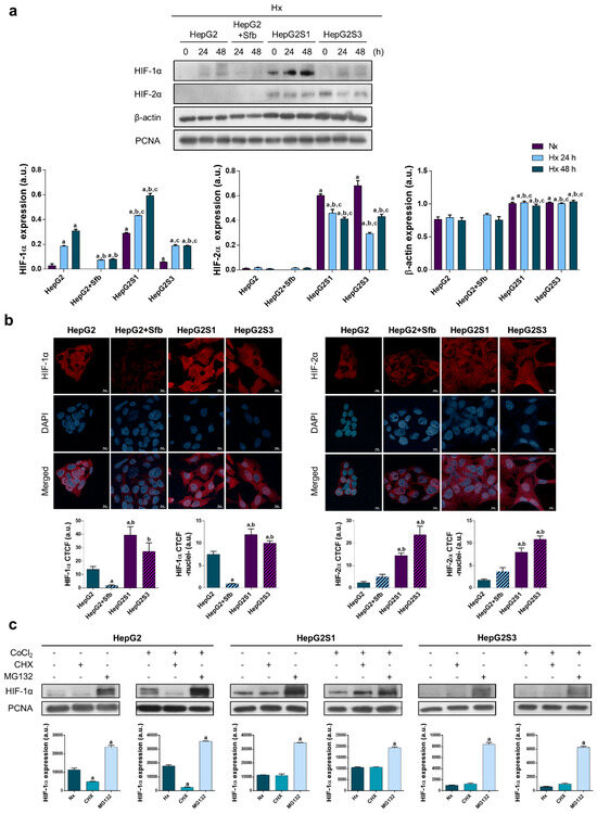 Cell modulation of hypoxia response in sorafenib resistance: (a) Effect of hypoxia on protein expression. Lanes 0 h show normoxic basal protein levels. a p < 0.05 vs. normoxic non-treated HepG2 cells, b p < 0.05 and c p < 0.05 vs. hypoxic non-treated and sorafenib-treated HepG2 cells, respectively, at each time point; (b) Confocal images of hypoxia-inducible factor (HIF)-1α (left panel) and HIF-2α (right panel) immunofluorescence staining (red) show HIFs expression after incubation under hypoxia for 24 h. DAPI staining (blue) denotes cell nucleus. Magnification: 63×, scale bar: 10 µm. Bar graphs at left position represent total expression whereas bar graphs at right position represent nuclear translocation for each marker analyzed. a p < 0.05 and b p < 0.05 vs. non-treated and sorafenib-treated HepG2 cells, respectively; (c) Evaluation of HIF-1α protein synthesis and degradation processes. a p < 0.05 vs. normoxia/hypoxia within the same cell type. Data from (a–c) are expressed as mean values of arbitrary units (a.u.) ± SD of three independent experiments. Full-length immunoblots are presented in Supplementary Figure S1a.