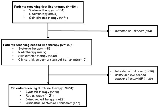 Patient disposition according to line of therapy. Numbers of patients receiving the different types of therapy add up to more than the total as treatments were received alone and in combination. MF, mycosis fungoides.