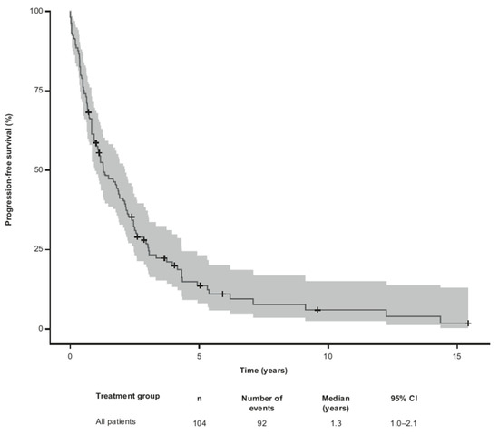 Kaplan–Meier estimates of progression-free survival from time of first relapsed/refractory MF. Defined as patients who progressed, relapsed or became refractory after therapy for first relapsed/refractory MF or deceased thereafter. The gray shade represents the 95% confidence intervals. CI, confidence interval; MF, mycosis fungoides.