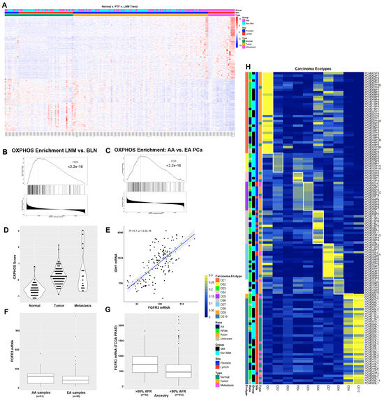 RNAseq analysis of 165 prostate cancer patient samples identifies oxidative phosphorylation as differentially expressed between AA and White patients and between LNM and benign lymph nodes. (A) Heat map of 704 genes that trend consistently upward or downward from normal to primary tumor foci to LNM. (B) GSEA plot of the oxidative phosphorylation gene set from a comparison of LNM to benign lymph nodes. (C) GSEA plot of the oxidative phosphorylation gene set from analysis of African-American vs. White patients with Gleason scores of 7. (D) OXPHOS score increases in from normal prostate to primary tumor to LNM. (E) FGFR3 is highly correlated with OXPHOS gene IDH1. (F) FGFR3 is expressed at higher levels in AA PCa than EA PCa in our cohort. (G) FGFR3 mRNA is significantly higher in patients with >50% African ancestry in the TCGA PRAD dataset. (H) Ecotyper analysis of 131 samples assigned to one of ten unique carcinoma ecotypes (CE).