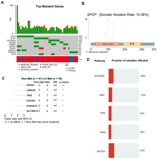 WES analysis of 137 prostate cancer patient samples identifies recurrent mutations associated with metastasis. (A) Graphical depiction of the top ten most frequently mutated genes in this study. Each column represents an individual tissue sample. Percentages on the right indicate the percentage of samples with mutations in that gene. Tumor mutational burden (TMB) for each sample is plotted along the top. (B) Lollipop plot of mutations detected in the SPOP gene. (C) Forest plot of mutations preferentially detected in patients with metastases. * <0.05; ** <0.01 (D) Signaling pathways most highly impacted by the detected mutations.