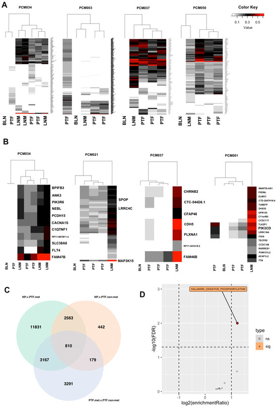 Analysis of metastatic and non-metastatic clones identifies oxidative phosphorylation as associated with metastasis. (A) Heatmaps of all identified mutations clustered based on allele frequencies. LNM are clonally related to most primary tumor foci. Some patients (PCM034 and PCM003) contained primary tumor foci that were not clonally related to others, although most patients did not. (B) Heatmaps of genes with significantly increased allele frequencies in LNM relative to primary tumor foci within the same patients indicating potential clonal selection. (C) Venn diagram of sets of significantly differentially expressed genes comparing normal prostate to metastatic primary tumor foci, normal prostate to non-metastatic primary tumor foci, and metastatic primary tumor foci to non-metastatic primary tumor foci. (D) Volcano plot of over-representation analysis of the 810 genes in the center of the Venn Diagram in panel C. Oxidative phosphorylation was the only significantly overrepresented pathway.