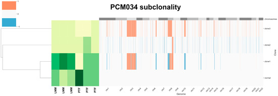 To examine subclones within each sample, we performed HATCHet analysis. The HATCHet software tool can compute tumor heterogeneity [34], copy number aberrations (CNAs), and whole-genome duplications (WGDs) to investigate tumor evolution and metastatic seeding patterns. We applied HATCHet analysis to our WES dataset and observed that most samples had subclonal populations (Figure 4). Patient PCM034, which had three LNM, was of particular interest and had three subclones. Clone 1 was enriched in all three LNM and was characterized by a gain of chromosomal arm 8q (containing c-MYC) and loss of chromosomal arm 8p (containing NKX3.1). The other subclones exhibited a gain of chr8 but no loss of 8p, suggesting that the gain of chr8 may have preceded the loss of 8p during tumor evolution in this patient.