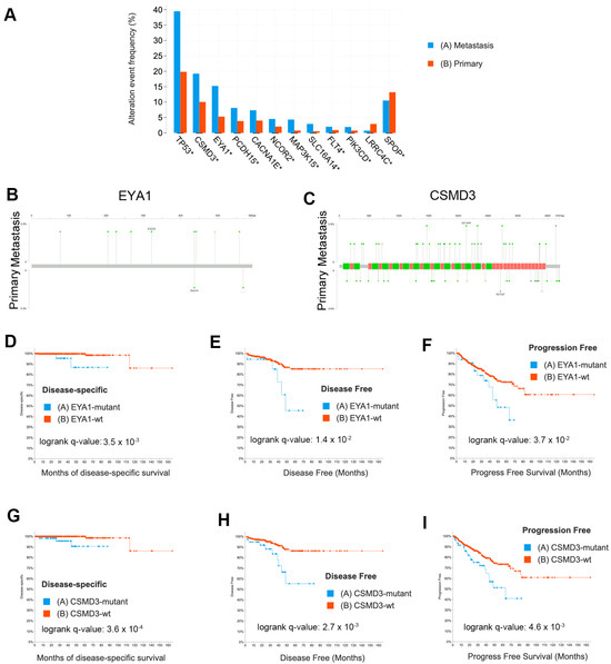 To evaluate the generalizability of our findings, we analyzed the mutations that we identified that appeared to be more frequent in LNM than in primary tumor foci or were frequently mutated in our cohort. We examined data from 12 published studies [2,3,6,40,41,42,43,44,45,46,47,48] that are publicly available in cBioPortal [36,37], comprising 8902 samples. Of those 8902 samples, 6650 samples (Supplementary Table S14) were definitively annotated as either primary tumors (n = 3929) or metastases (n = 2721). We found that mutations were enriched in metastases over primary tumors for TP53 (q = 2 × 10−64), EYA1 (q = 2 × 10−9), CSMD3 (q = 6.1 × 10−6), MAP3K15 (q = 3.3 × 10−5), PIK3CD (q = 2.2 × 10−4), SLC16A14 (q = 1.4 × 10−3), FLT4 (q = 1.6 × 10−3), PCDH15 (q = 2.1 × 10−3), CACNA1E (q = 1.5 × 10−2), and NCOR2 (q = 1.9 × 10−2) by a Fisher exact test adjusted for false discovery (Figure 5A). We found SPOP mutations were enriched in primary tumors (q = 3.1 × 10−3) and, surprisingly, LRRC4C were also enriched in primary tumors (q = 3.1 × 10−5). The complete list of mutations from this meta-analysis enriched in metastases or primary tumors includes well-established oncogenes and tumor suppressors such as AR, TP53, PTEN, RB1, APC, MYC, and CTNNB1 and is provided in Supplementary Table S15. Mutational comparisons for EYA1 and CSMD3 are shown in Figure 5B,C. To examine the clinical significance of these mutations, we compared the disease-specific survival (492 patients) in the TCGA PanCancer dataset [45], disease-free survival (334 patients), and progression-free survival (494 patients) for samples with and without EYA1 (Figure 5D–F) or CSMD3 (Figure 5G–I) mutations (including SNV, CNV, and structural variations) and found that mutations in both these genes were significantly associated with poor outcomes. FLT4 had only five mutated samples in the TCGA PRAD dataset and, thus, did not have enough events to provide statistically meaningful data and was not statistically significant. PCDH15 had more mutated samples (n = 18) but did not indicate statistical significance for disease-free survival, progression-free survival, overall survival, or disease-specific survival.