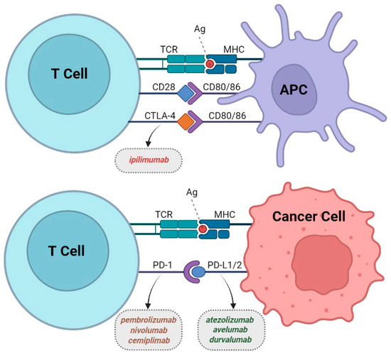 Cytotoxic T-lymphocyte-associated protein 4, or CTLA-4 (Figure 1), is a transmembrane receptor expressed in activated T cells that binds CD80 or CD86 (B7 ligands), both of which are expressed on the surface of antigen-presenting cells (APCs) and produce inhibitory signals to diminish the immune response. CTLA-4 binds B7 ligands with more avidity than CD28, which normally produces positive signals. In the early stages of carcinogenesis, CTLA-4 can reduce T-cell activation and allow cancer proliferation. By blocking the co-inhibitory receptor CTLA-4 using “checkpoint-blocking” antibodies, T cells can create a cytotoxic immune response in the tumor microenvironment (TME) [12,13,14].
