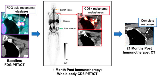 Farwell et al. [42] demonstrated, in phase 1 of the first in-human PET imaging research, the safety and possible predictive value of a [89Zr]Zr-labeled anti-CD8 mini-body in 15 patients with metastatic solid tumors (melanoma, NSCLC, and hepatocellular carcinoma) treated with immunotherapy (Figure 3). Before them, Pandit-Taskar et al. in 2020 [43] showed a preliminary report on an evaluation of [89Zr]Zr-Df-IAB22M2C imaging in 6 patients with solid tumors who were either undergoing or likely to undergo immunotherapy. In their study, CD8 PET imaging with [89Zr]Zr-Df-IAB22M2C resulted in the safe and accurate visualization of the whole-body biodistribution of CD8 leukocytes in tumors and CD8-rich tissues. The maximum uptake was at 24–48 h after the injection, with low background activity in CD8-poor tissues. Farwell et al. [42] confirmed the previous results and although the study was not designed to correlate the tumor uptake with response therapy, they evaluated CD8 PET scans after the initiation of immunotherapy in 3 patients with a good response to therapy at the clinical follow-up. Their CD8 PET scans demonstrated a high [89Zr]Zr-Df-IAB22M2C tumor uptake, suggesting that the presence of CD8 tumor-infiltrating lymphocytes correlated with the subsequent therapy response. More data are expected from this radiotracer; since it has been under investigation, a phase II clinical trial has also analyzed different solid tumors (NCT03802123).