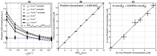 (a) Fluorescence singular decomposition (SVD) amplitude (arbitrary unit) for phantom experiments with different optical properties with the same Photofrin concentration (μa,ref = 0.64 cm−1, μs,ref′ = 10 cm−1). The fitting result of the corrected SVDcor is depicted by the blue dotted curve. The dashed curves illustrate the fitting obtained using SVD (μa,ref, μs,ref′)/CF (μa, μs′). (b) Photofrin concentration calibration curve. (c) The validation of in vivo measured photosensitizer concentration using the contact probe (based on fluorescence spectroscopy) against the ex vivo measured Photofrin concentration.