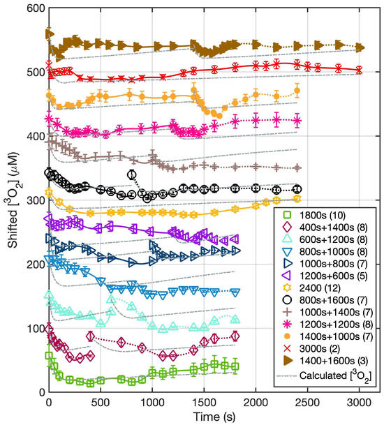 The temporal changes of ground state oxygen concentration versus time at a 3 mm depth for the treatment conditions. During the 2 h dark interval, no measurement was taken. The solid lines represent the measured temporal dependence of [3O2] over the course of treatment with the symbols representing [3O2] measured at discrete time points during PDT. The grey dash lines represent the calculated oxygen concentration ([3O2]calc) at a 3 mm depth calculated using Equations (2)–(4) and the parameters summarized in Table 1. The data for all groups, except for the “1800 s” group, are shifted by 100 on the y-axis for visualization.