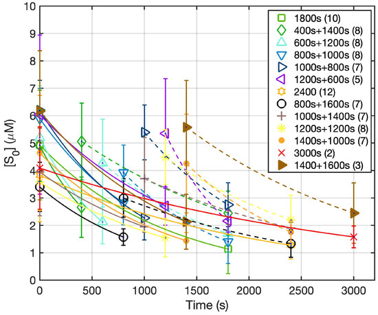 The dependence of Photofrin concentration vs. time for all treatment conditions. During the 2 h dark interval, no measurement was taken. The solid curves represent calculated Photofrin concentration based on Equations (2)–(4) during PDT treatment. The solid line represents the first fractionation and the dashed lines represent the second light fractionation. The symbols represent the measured PS concentration ([S0]).