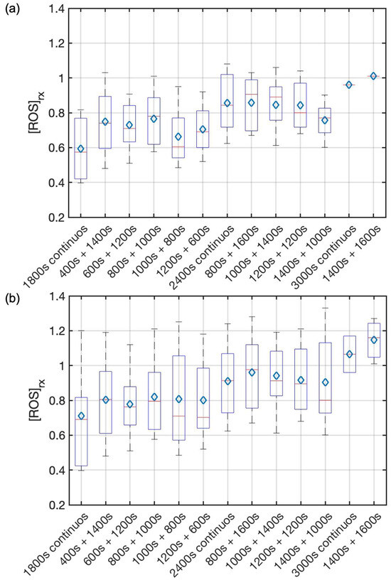 Comparison of total [ROS]rx between different treatment schemes of (a) all mice and (b) mice with [ROS]rx ≥ 1.1 mM excluded. On each box, the central mark and the central blue diamond indicate the median and the mean, respectively, and the bottom and top edges of the box indicate the 25th and 75th percentiles, respectively. The whiskers extend to the most extreme data points not considered outliers. The total amount of [ROS]rx produced during PDT is similar for all fractionated groups. The improvement in treatment efficacy observed in the fractionated PDT groups is not correlated with the total reactive oxygen species ([ROS]rx) levels.