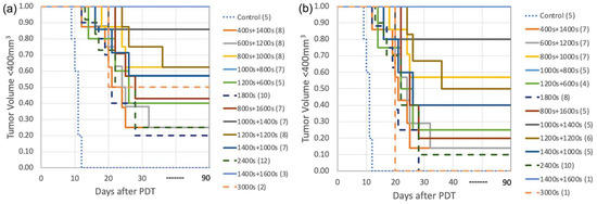 Kaplan–Meier curves were constructed to delineate the Local Control Rate (LCR) across all experimental groups [45]. After PDT, daily monitoring of tumor size was performed until attainment of a tumor volume equal to or surpassing 400 mm3. Within this context, the successful absence of tumor regrowth within a span of 90 days post-PDT was regarded as a “cure”. Tumor response data are presented in Table 2.