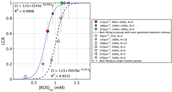 To illustrate the improvement between 2-segment separated of 2 h dark period fractionated PDT treatment vs. continuous single-fraction PDT treatment with the same total treatment time, Figure 8 compares the [ROS]rx response curve. The fitting for the optimal groups, represented by the blue dotted curve, clearly shifts to the left compared to the fitting curve of the single-fraction groups (black dashed curve). Note that in this figure, the result for single-fraction groups is shown for illustrative purposes. A comparison of the two fitting curves allows us to draw the conclusion that for mice with comparable levels of total [ROS]rx production, those undergoing fractionated PDT tend to exhibit a higher long-term LCR, indicating an improved treatment outcome. Additionally, through this analysis, we have been able to ascertain the threshold [ROS]rx for optimal fractionated Photofrin-mediated PDT, which stands at 0.78 mM. This value is notably lower than the threshold dose for single-fraction PDT, at 1.08 mM (the exact value may not be accurate).