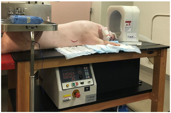 Experimental treatment table with a programmable 7.5 kW RF power generator underneath and a 133 kHz RF induction coil on top, and an anesthetized pig in preparation for surgical implantation of a TBT balloon for in vivo brain-heating experiment.