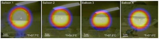 The balloons were first tested in air inside the RF coil under high stress conditions for about 20 min multiple times. Figure 6 shows the infrared images of one of these stress tests, noting that the nanofluid temperature recorded via the fiber optic sensor reached 60 °C. The infrared images were taken within 30 s after power off, which justifies the slightly lower maximal temperature recorded (57.7–59.3 °C). All balloons endured the stress tests without any apparent degradation from the heat. The balloon wall material was also unaltered from visual inspection and tactile perception.