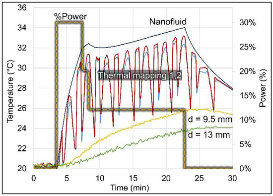 The assembled phantom was positioned at the center of the RF coil to surround the nanofluid with a uniform magnetic field. Field homogeneity within the coil has been reported previously [41]. The pre-programmed power sequence Job #1 (Table 2) was used to reach a peak temperature of 34 °C inside the nanofluid, starting from room temperature at 20 °C, i.e., a temperature increase of ΔT = 14 °C. At the end of each heating experiment, the phantom was removed from the coil and the two halves were separated to expose the bottom phantom surface. High-resolution 2D thermal images were taken with an infrared camera (FLIR E95, Teledyne FLIR LLC, Wilsonville, OR, USA) within 30 s after power was turned off to minimize thermal dissipation of the internal temperature distribution.