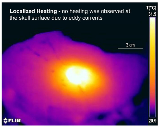 Figure 8 shows an infrared thermal image of the bottom half of the split-phantom 2 min after power off, where we can observe spherically symmetric heating that is well localized around the balloon. No heating is observed at the skull surface, which conceivably could occur from eddy currents if excessive magnetic fields were used. This lack of surface tissue heating illustrates the safety of this device since heating is restricted to the intended at-risk tumor margin near the nanofluid-filled balloon.