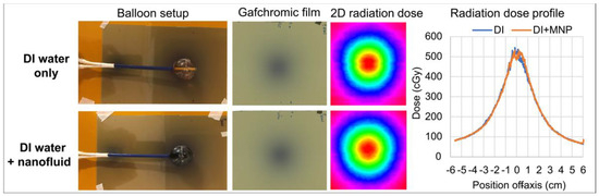 Figure 9 shows the 2D dose distributions measured with Gafchromic film comparing two different balloon fillings: with and without nanofluid. Radiation dose profiles measured in a plane tangent to the balloon agreed with each other within 10%.