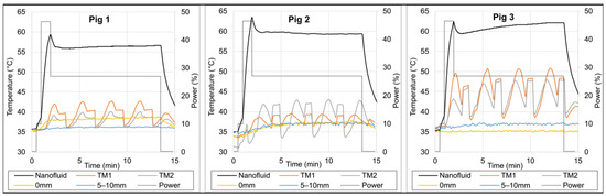 Figure 10 presents the temperatures recorded along the thermal maps adjacent to the balloon and at stationary locations around the 1 cm balloon in three live pig brains. Within 12 min of heating, the maximum temperatures measured by the thermal mapping probes ~1 mm from the balloon surface (TM1 and TM2) ranged from 42 to 50 °C for the three pigs, i.e., the temperature increase ΔT above the core temperature (36 °C) ranged from 6 to 14 °C.
