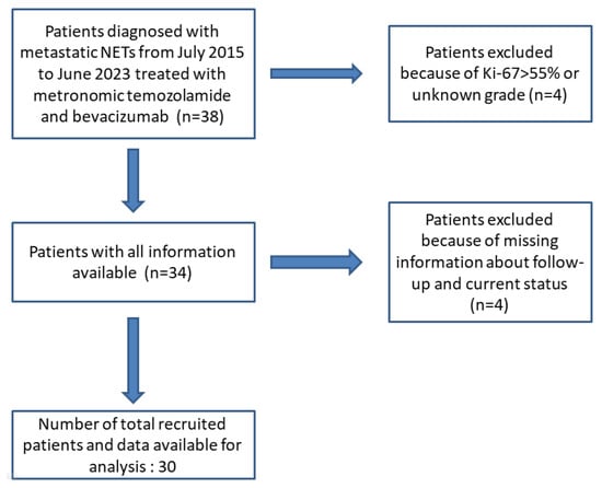 This investigation is a retrospective analysis of prospectively captured data concerning 30 patients diagnosed with stage IV neuroendocrine tumors (either de novo or upon relapse). These patients were treated with mTMZ and bevacizumab and followed by Prof. Dr. Sezer Sağlam from July 2015 through to June 2023. Out of the 38 patients administered mTMZ and bevacizumab, only 30 were included for analysis in this study due to the reasons elucidated in Figure 1. We excluded patients exhibiting a Ki-67 value exceeding 55% [27,28]. Furthermore, to eliminate potential tumor heterogeneity, those with neuroendocrine carcinoma were not considered [27,28]. The cohort was stratified based on tumor grade (grade 1 and 2 vs. grade 3), Ki-67 levels (≤20%, 21–55%), and treatment outcomes with specific regard to PFS and OS.