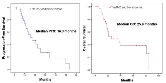We examined the duration of current treatment administration, the reasons for discontinuation of the treatment, and side effects. The follow-up period was defined as the time from disease diagnosis to the last follow-up or date of death. The duration from when mTMZ and bevacizumab treatment began to the point of disease progression or any cause of death was used to determine the progression-free survival (PFS). For patients who remained alive without disease progression, their data was censored as of their last known visit. The overall survival (OS) was characterized as the period between the commencement of current combined therapy and the date of death, regardless of the cause.