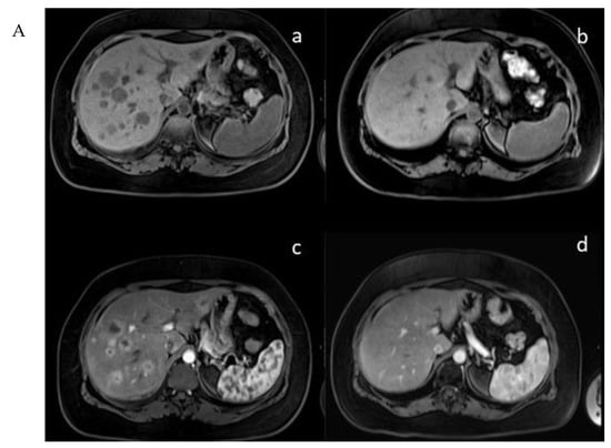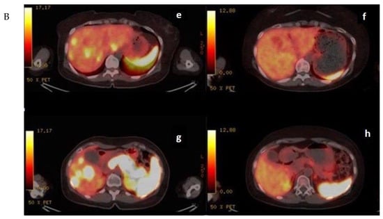 (A) (upper) Downstaging tumors (complete response) after metronomic TMZ–bevacizumab combination therapy. MRI images for the patient with metastatic NET before (a,c) and six months after treatment (b,d); (B) (bottom) downstaging tumors (complete response) after metronomic TMZ–bevacizumab combination therapy. Gallium-68 (Ga-68)-DOTATATE positron emission tomography (PET) images for the patient with metastatic NET before (e,g) and one year after treatment (f,h).