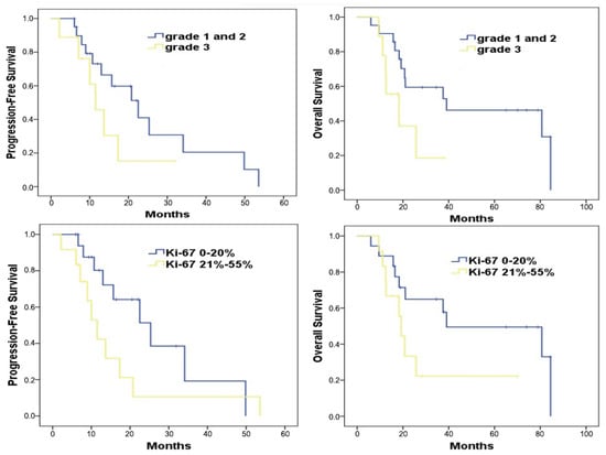 Survival analysis of patients treated with mTMZ and bevacizumab treatment according to the grade 1, 2 vs. 3 (upper) and Ki-67 groups (≤20%, 21–55%) (bottom).