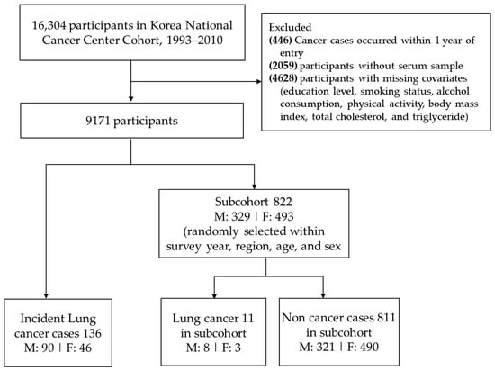 The obtained serum samples were stored at −70 °C (between 1993 and 2008) and were preserved at −140 °C (between 2009 and 2010). The collected data were linked to national cancer incidence data from the Korea Central Cancer Registry, with follow-up until 31 December 2017.