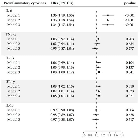 The hazard ratios (HRs) are presented for each unit increase in natural log-transformed proinflammatory cytokines, derived from Cox proportional-hazards models. Model 1 was unadjusted; Model 2 was adjusted for sex; Model 3 was further adjusted for year of enrollment, region, education achievement, cigarette smoking status (never, former, and current), number of pack-years (continuous variable), alcohol consumption status (non-drinkers, <24 g per day, and ≥24 g per day), and BMI (continuous variable).