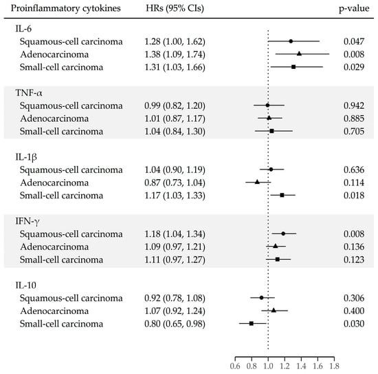 Figure 3 shows that IL-6 was associated with lung cancer, regardless of the histological type (HR [95% CI]: squamous-cell carcinoma, 1.28 [1.00–1.62]; adenocarcinoma, 1.38 [1.09–1.74]; small-cell carcinoma, 1.31 [1.03–1.66], respectively). IL-1β had an association only with small-cell carcinoma (HR [95% CI]: 1.17 [1.03–1.33], while IFN-γ had an association only with squamous-cell carcinoma (HR [95% CI]: 1.18 [1.04–1.34]).