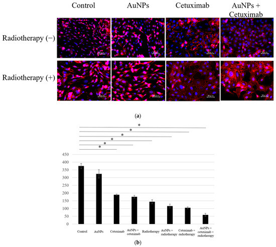 (a) Cells were divided into eight groups and immunostained using DAPI and E-caderin, after which the number of cells was counted. (b) Compared with the control group, the cell count was lower in all treatment groups, excluding the AuNPs group. The largest decrease was observed in the AuNPs + cetuximab + radiotherapy group. AuNPs, gold nanoparticles. * (Asterisk marks) indicate statistically significant differences.