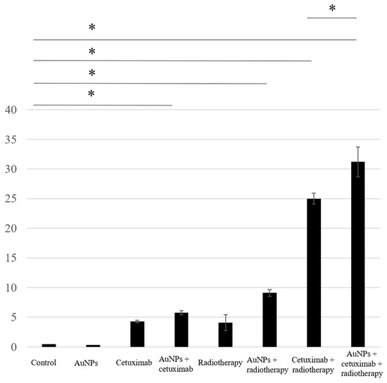 We assessed apoptosis in HSC-3 cells following treatment with AuNPs, cetuximab, and/or radiotherapy by counting the number of cells positively stained for caspase-3. The average percentages of apoptosis-positive cells for the control, AuNPs, cetuximab, and AuNPs plus cetuximab were 0.4%, 0.3%, 4.3%, and 5.8%, respectively, and increased to 4.1%, 9.1%, 25%, and 31% when radiation was added to each treatment. Significant differences were observed between the control and AuNPs + radiation groups, the control and radiation + cetuximab groups, and the control and radiation + cetuximab + AuNPs groups (p < 0.001). Significant differences were also observed between the radiation + cetuximab and radiation + cetuximab + AuNPs groups (p = 0.0144). The detailed results are presented in Figure 2.