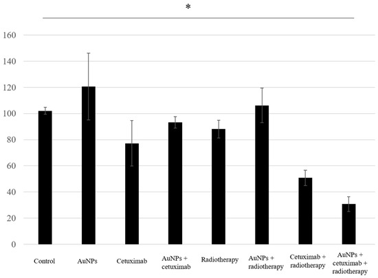 Proliferation assay results showed that the average cell growth percentages were 102% for the control, 120% for AuNPs, 77% for cetuximab, and 93% for AuNPs plus cetuximab, and 88%, 106%, 51%, and 31% when radiation was added to each condition. Cell proliferation was significantly reduced in the AuNPs + cetuximab + radiotherapy group compared with the control group (p = 0.0049). The detailed results are presented in Figure 3.