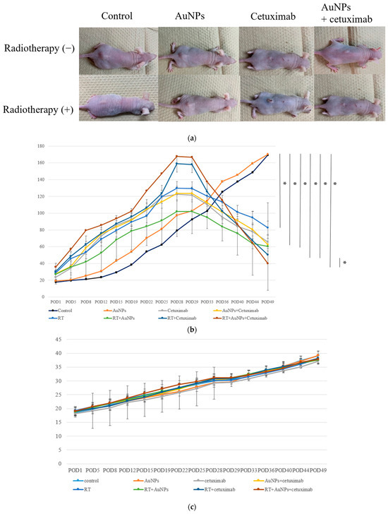 (a) Photographs of subcutaneous tumors on the backs of eight groups of representative nude mice at POD49. (b) After approximately 4 weeks, the tumor volume reached its maximum, after which point AuNPs and cetuximab were injected into the tumors. On the next day, tumors were irradiated and then monitored for 3 weeks. The tumor volume continued to increase in the control and AuNPs groups, whereas tumor shrinkage was noted in the other groups. The greatest tumor shrinkage was observed in the AuNPs + cetuximab + radiotherapy group. (c) Body weight tended to increase in all individuals, and no significant difference was observed among the groups. AuNPs, gold nanoparticles; RT, radiotherapy; POD, postoperative day. * (Asterisk marks) indicate statistically significant differences.