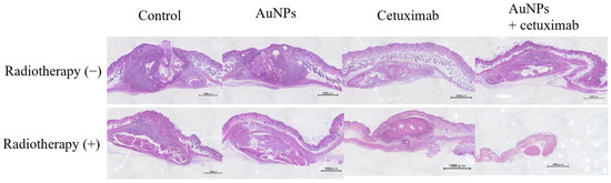 This study revealed that combination treatment with AuNPs, cetuximab, and radiotherapy significantly reduced HSC-3 cell counts (Figure 1, Figure 2 and Figure 3). Furthermore, this combination treatment led to tumor shrinkage in vivo, as shown in Figure 4 and Figure 5, without toxic findings in major organs, as shown in Figure 7. As shown in Figure 6, the strength of this study also lies in the demonstration of the localization of gold nanoparticles within the excised tumor. AuNPs alone do not have a tumor-suppressing effect, but they sensitize tumors to radiotherapy and bind to cetuximab, leading to enhanced antitumor effects. (Figure 1, Figure 2, Figure 3, Figure 4 and Figure 5). The reduction in cell counts following treatment with AuNPs, cetuximab, and radiotherapy was attributable to apoptosis (Figure 2). This is the first report to examine the combined effects of AuNPs, cetuximab, and radiotherapy in mice with HNSCC.