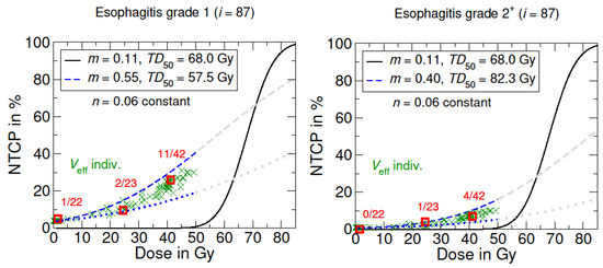 NTCP models for radiation-induced acute side effects to the esophagus. The black curve shows the origin LKB dose–response model based on the literature data from Burman et al. [16,24], concerning full organ irradiation (). The blue curves represent the adapted LKB dose–response model for esophagitis grade 1 and grade 2+. The dotted blue line corresponds to the irradiation of the lowest partial volume in the patient cohort. Grayed-out curves show the supposed course for higher dose values >50 Gy. Optimized model parameters were determined via LMQ optimization. The patient-specific NTCPs with individual irradiated effective volumes are marked with a green X, which are summed up into groups (red squares).