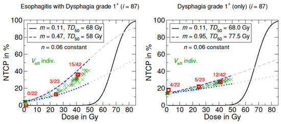 Moreover, the results demonstrated that a combined NTCP model for esophagitis with dysphagia is more appropriate compared to a separate view of the symptom only. Thus, it could be questionable to investigate the symptom of dysphagia separately from its causal effect or diagnosis. In addition, some patients already have dysphagia at the beginning of treatment, e.g., caused by chemotherapy or by the NHL itself. This is also reflected in the NTCP curve, since at 0 Gy there is already a probability of esophagitis of approximately 5% or 12% for dysphagia (Figure 1 and Figure 2). In the context of acute symptoms, which occur during radiation therapy, relating them to a DVH representing the entire treatment course might be problematical. Instead, Marks et al. suggested to link acute events to the dose administered before symptom onset, especially considering any latency time [22]. This procedure could be a better way to derive a more accurate dose–response model for the onset of acute symptoms.