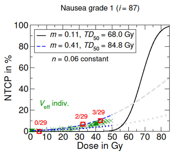 NTCP model for radiation-induced nausea. The black curve shows the origin LKB dose–response model based on the literature data from Burman et al. [16,24], concerning full organ irradiation (). The blue curves represent the adapted LKB dose–response model for a nausea grade 1. The dotted blue line corresponds to the irradiation of the lowest partial volume in the patient cohort. Grayed-out curves show the supposed course for higher dose values >50 Gy. Optimized model parameters were determined via LMQ optimization. The patient-specific NTCP with individual irradiated effective volumes are marked with a green X, which are summed up into groups (red squares).