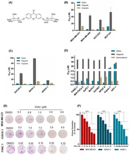 Growth inhibitory activity of XGAc in TNBC, ovarian cancer and PDAC cells. (A) XGAc chemical structure. (B–D) IC50 values of XGAc, olaparib, cisplatin and gemcitabine in TNBC (B), ovarian cancer (C) and PDAC (D) cells were determined after 48 h of treatment by SRB assay; data are mean ± SEM of three independent experiments (two replicates each). (E,F) Effect of XGAc on colony formation of cancer cells after 15 days of treatment. In (E), representative experiments are shown. In (F), quantification of colony formation; growth obtained with DMSO was set as 100%; dotted lines represent the 50% growth inhibition. Data are mean ± SEM of three independent experiments; values significantly different from DMSO: * p < 0.05, ** p < 0.01, **** p < 0.0001 (two-way ANOVA followed by Dunnett’s test).