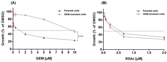 Concentration-response curves for gemcitabine (GEM; (A)) and XGAc (B) in non-resistant (parental) and GEM-resistant MIA-PaCa-2 cells, after 48 h of treatment by SRB assay. Growth obtained with control (DMSO) was set as 100%. Dotted lines represent the 50% growth inhibition. Data shown are mean ± SEM of three independent experiments (two replicates each); values of GEM-resistant cell growth significantly different from parental cells: **** p < 0.0001 (two-way ANOVA followed by Sidak’s test).