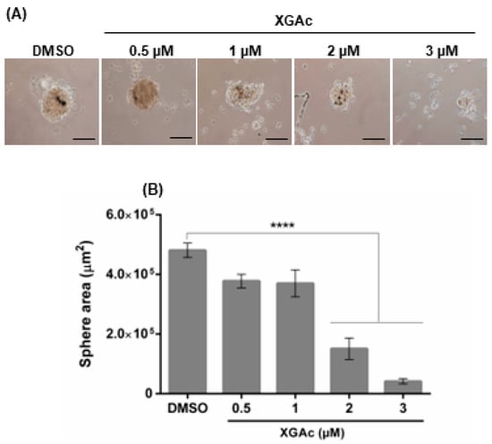 Growth inhibitory effect of XGAc on a 3D model of TNBC cells. Evaluation of HCC1937 mammosphere formation after 72 h of treatment with XGAc; treatment was performed at the seeding time. In (A), representative images are shown (scale bar = 50 µm, 100× magnification). In (B), quantification of mammosphere area at the end of treatment; data are mean ± SEM of three independent experiments; values significantly different from DMSO: **** p < 0.0001 (one-way ANOVA followed by Dunnett’s test).
