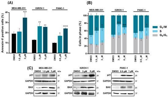 We next verified that the growth inhibitory effect of XGAc went along with a significant induction of apoptosis (annexin V-positive cells) in MDA-MB-231 (at 3 µM), IGROV-1 (at 3 and 6 µM) and PANC-1 (at 0.5 and 1 µM) cells after 48 h of treatment (Figure 4A). Additionally, after 48 h of treatment, XGAc significantly induced cell cycle arrest at S-phase in MDA-MB-231 (at 1.5 and 3 µM), IGROV-1 (at 3 and 6 µM) and PANC-1 (at 1 µM) (Figure 4B). Consistently, 48 h treatment with XGAc increased the protein expression levels of cell cycle and proapoptotic regulators, p21 and BAX, respectively, in MDA-MB-231, IGROV-1 and PANC-1 (Figure 4C).