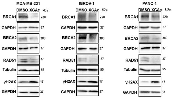 XGAc regulates the expression levels of proteins involved in homologous recombination DNA repair in TNBC, ovarian cancer and PDAC cells. Effect of 1 µM (in PANC-1), 3 µM (in MDA-MB-231) or 6 µM (in IGROV-1) of XGAc on protein expression levels of BRCA1, BRCA2, RAD51 and γH2AX, after 48 h of treatment. Representative immunoblots are shown; GAPDH or tubulin were used as loading controls. The uncropped blots are shown in Figure S3.