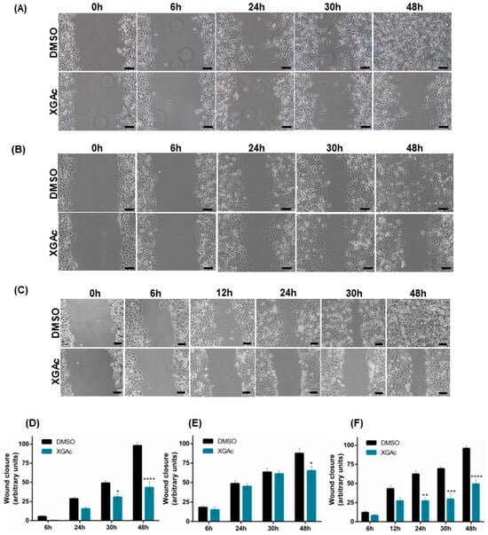 XGAc inhibits TNBC, ovarian cancer and PDAC cell migration. Effect of 47 nM, 200 nM and 16 nM of XGAc (IC10 concentration of XGAc in MDA-MB-231, IGROV-1 and PANC-1, respectively) or DMSO on confluent cancer cell migration after 6 h, 12 h, 24 h, 30 h and 48 h of treatment, by a wound healing assay. In (A–C), representative images are shown (scale bar = 100 µm, 100× magnification) for MDA-MB-231 (A), IGROV-1 (B) and PANC-1 (C). In (D–F), the quantification of the wound closure is represented for MDA-MB-231 (D), IGROV-1 (E) and PANC-1 (F). Quantification was performed considering randomly selected microscopic fields (four fields per sample), setting the initial wound area as 100%; data are mean ± SEM of three independent experiments; values significantly different from DMSO: * p < 0.05, ** p < 0.01, *** p < 0.001, **** p < 0.0001 (two-way ANOVA followed by Sidak’s test).