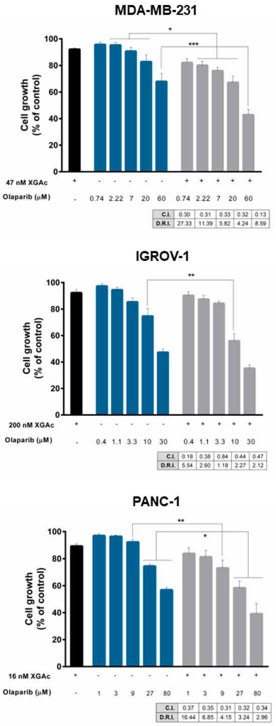 XGAc displays synergistic effects with olaparib in TNBC, ovarian cancer and PDAC cells. Effect of XGAc alone (IC10 concentration, represented by a black bar), olaparib alone (represented by blue bars) and XGAc in combination with a concentration range of olaparib (represented by gray bars), on proliferation of cancer cells, determined by SRB assay after 48 h of treatment. Growth obtained with DMSO was set as 100%; data are mean ± SEM of four independent experiments (two replicates each); growth significantly different from olaparib alone: * p < 0.05, ** p < 0.01, *** p < 0.001 (two-way ANOVA followed by Sidak’s test). C.I. and D.R.I. values were obtained using CompuSyn software (C.I. < 1, synergy; 1 < C.I. < 1.1, additive effect; C.I. > 1.1, antagonism).